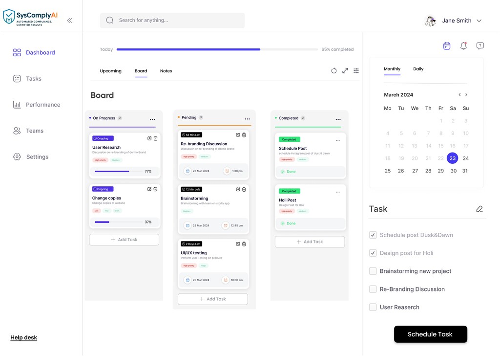 SysCertAI streamlines document management, compliance tracking, user access, and facilitates audits with intuitive dashboards.